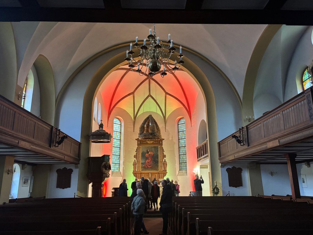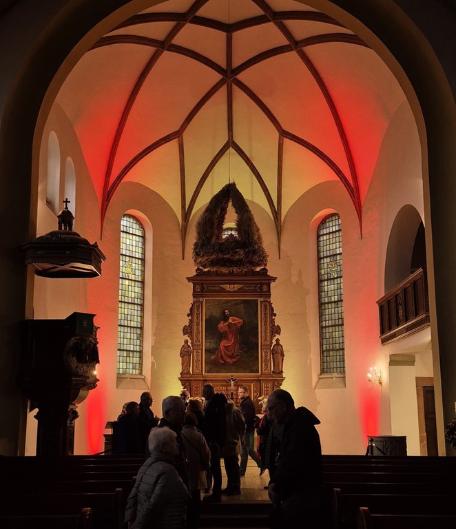 Nach kurzer Begrüßung vor der Kirche stellte der Vorsitzende des Kirchenvorstandes Thomas Grän in einem sehr interessanten und berührenden Vortrag die St. Jacobuskirche Pesterwitz, die Besonderheiten der Kirche und das Altarbild von Robert Sterl vor. Der Chor der Kirche war magisch beleuchtet, so dass das Altarbild von Robert Sterl hervortrat. Eindrucksvoll war auch, wie Thomas Grän mit Hilfe einer Taschenlampe die Wirkung zeigte, die das Gemälde am Sonntagmorgen im Gottesdienst entfaltet, wenn die Sonne durch die Jugendstilfenster auf das Gesicht von Jesus fällt.