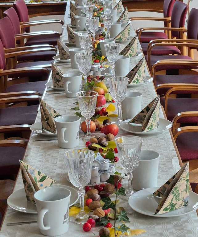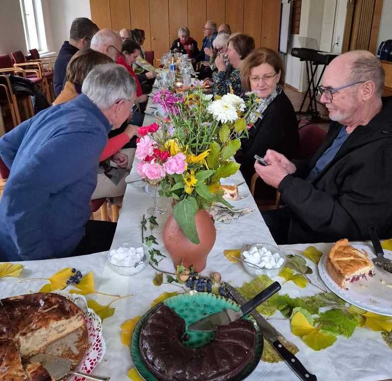 Danach ging es ins Pfarrhaus zu der von Margitta Kreisel gedeckten Kaffeetafel. Es war mit insgesamt 20 Personen zwar etwas eng, aber gemütlich. Es wurde mit einem Pesterwitzer Müller-Thurgau angestoßen. Zum Kaffee standen fünf selbstgebackene Kuchen bereit. Alle sehr lecker. In angeregter Stimmung gab es viele interessante Gespräche.