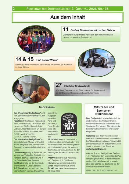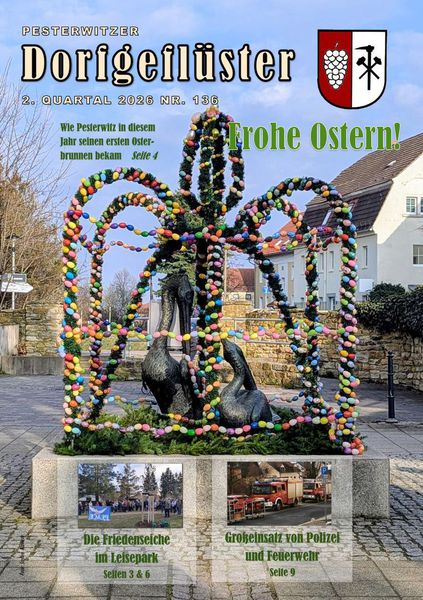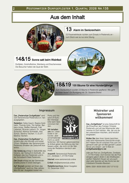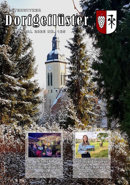 Viermal im Jahr erscheint das „Dorfgeflüster“, die Vereinszeitschrift des Seniorenclubs Pesterwitz. Sie berichtet über das aktuelle Geschehen im Ort, gibt Einblicke in das Leben der Vereine und bringt Geschichten, Ausflugstipps, Fotos und vieles mehr direkt zu den Menschen in unserem Stadtteil.