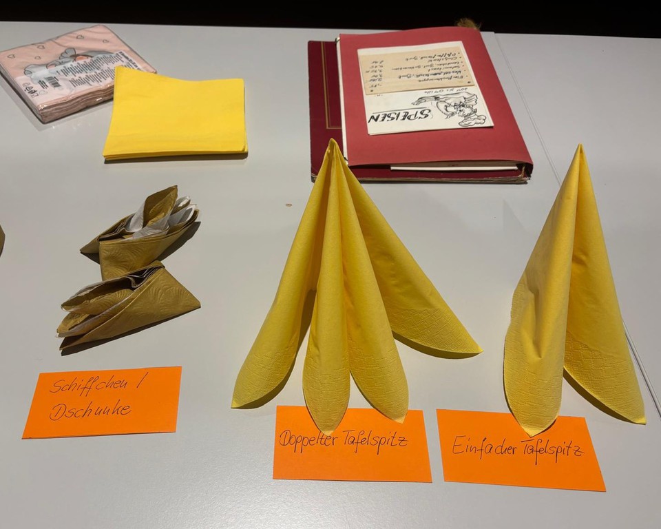Mit einem leckeren Stück Erdbeertorte gestärkt, haben wir uns danach zum Thema Servietten, deren Geschichte und dem richtigen Umgang laut Knigge ausgetauscht.