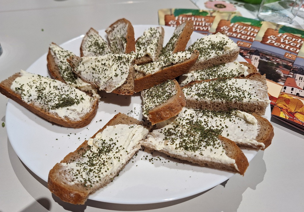 Die Weinprobe begann mit einem Gelben Muskateller, gefolgt vom Grünen Veltliner, einem grünen Veltliner Spätlese "Sommerrain", einem Blauen Zweigelt und einem Roséwein "Der Sommerfrische". Damit die einzelnen Kostproben ausreichend zur Geltung kommen konnten, wurde mit dem leckeren Brot von Herrn Ihm, den vorbereiteten Käsespießen und reichlich Wasser neutralisiert.