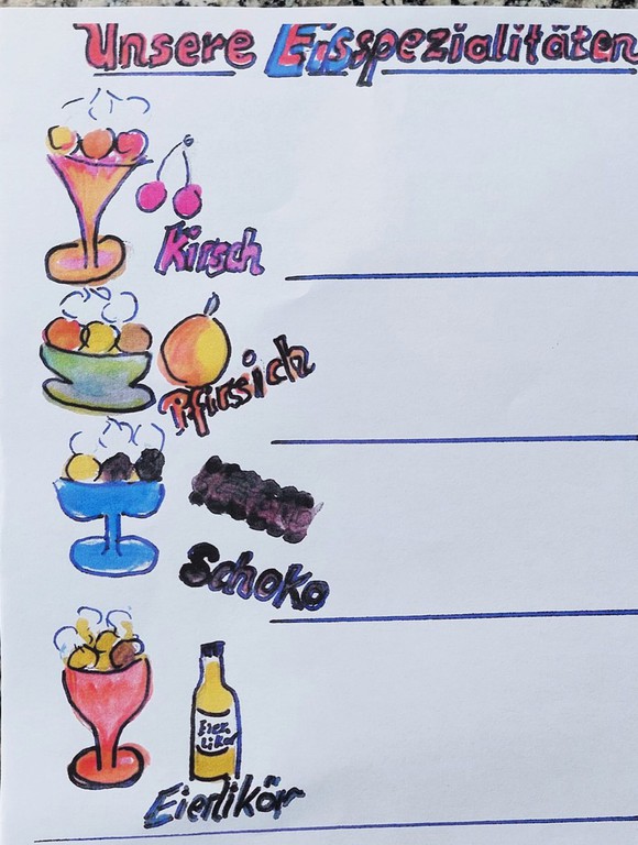 Unser Kaffeetrinken wurde mit leckeren Obsttörtchen eingeleutet, bevor für jeden eine individuelle Eisbombe hergestellt wurde. Eigens dafür hat Frau Nentwich eine Eiskarte kreiert.