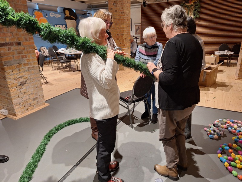 Heute war ein kreativer Nachmittag angesagt. Zunächst wurde das Programm besprochen, welches mit dem Schulchor zur Eröffnung des Osterbrunnens geplant ist. Nach dem Kaffeetrinken wurde erstmalig das Gerüst unseres künftigen Osterbrunnens vor- und aufgestellt. Dann ging es ans Schmücken, denn das nackte Metallgerüst musste mit den grünen Weihnachtsgirlanden umwickelt werden.