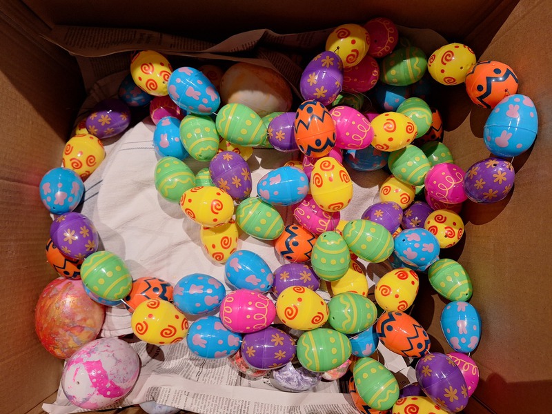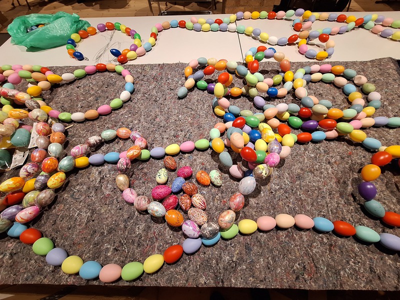 Als das geschafft war, kamen unsere aufgefädelten Ostereier zum Einsatz, indem die Girlanden schließlich mit den Eierketten umwickelt wurden.