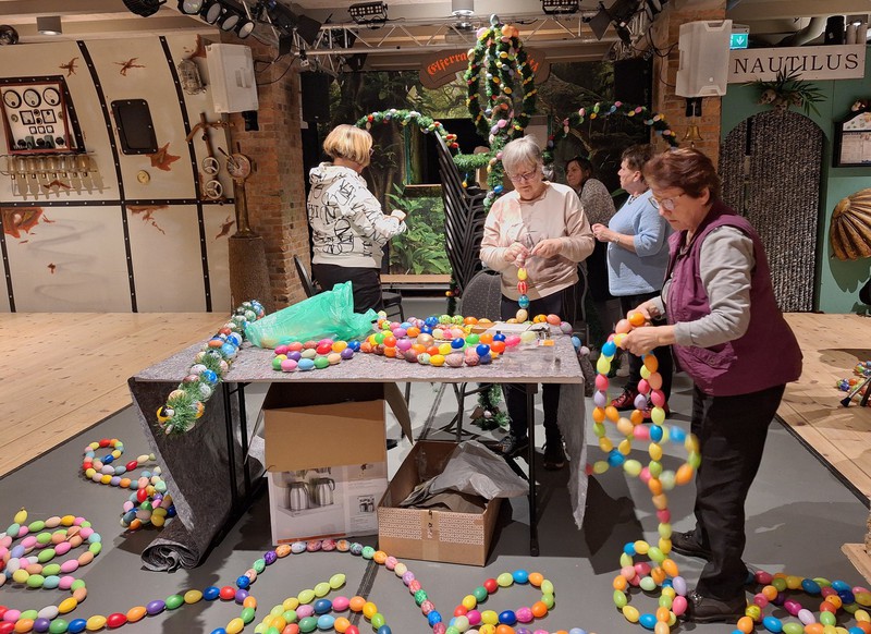 Es wurde Hand in Hand gearbeitet uns so entstanden die ersten Meter der "Eierketten" für den Osterbrunnen.